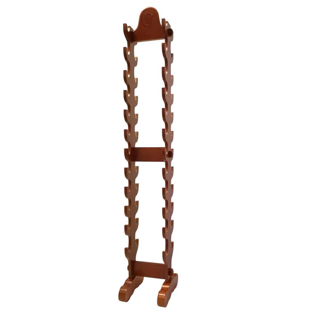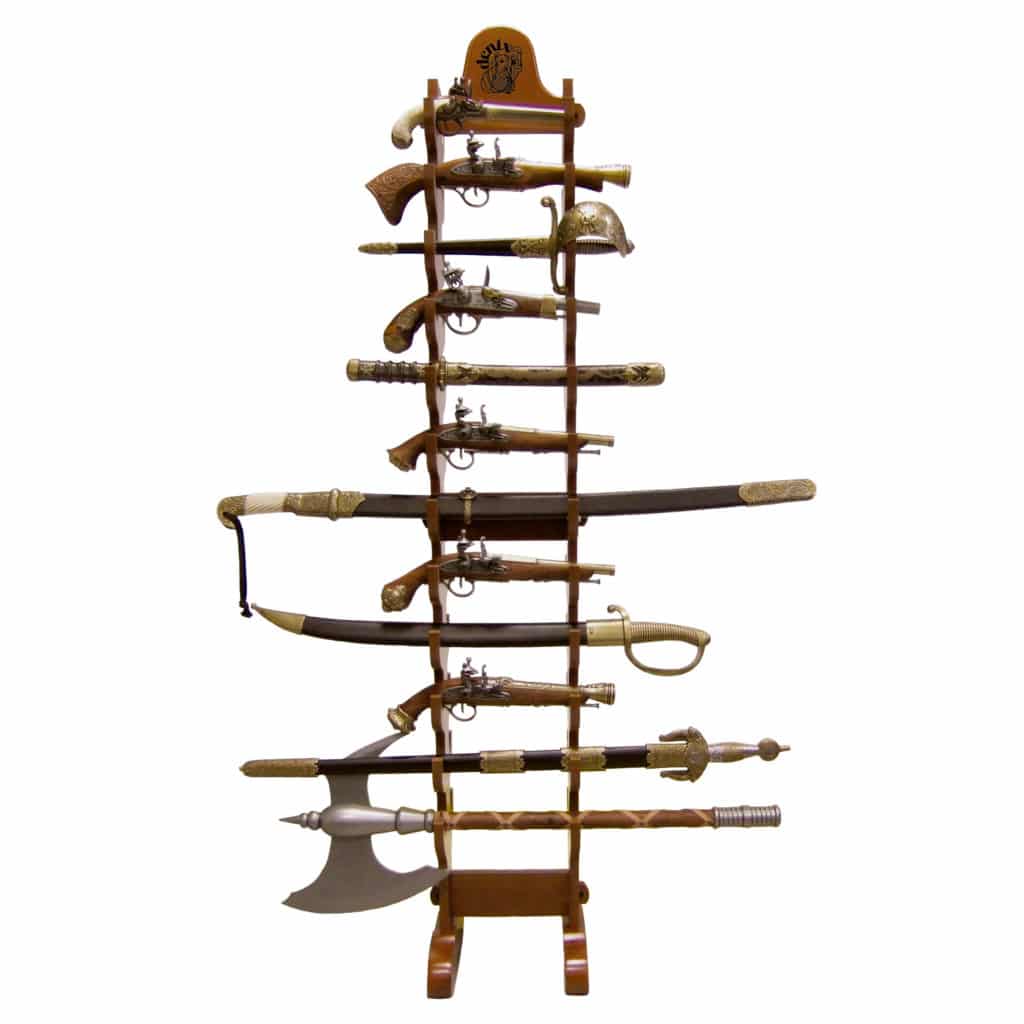 This large wooden floor stand lets you display your entire weapons collection neatly arranged. The stand has its own base, so it stays sturdily upright without having to screw it to a wall. The stand can therefore be set up even in the middle of the room.