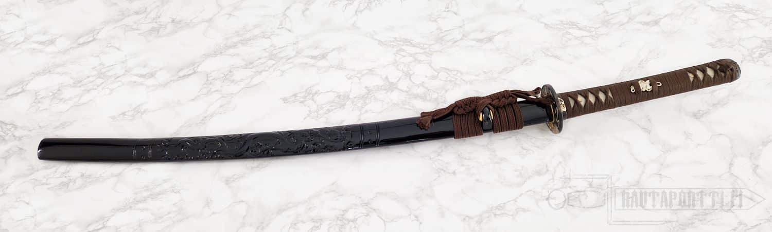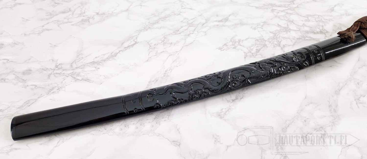 The saya is true one of a kind masterpiece. The all black hardwood scabbard features a gorgeous hand carved dragon and genuine buffalo horn koiguchi, kojiri and kurikata. A brown premium grade silk sageo and multiple layers of black lacquer give a finishing touch.