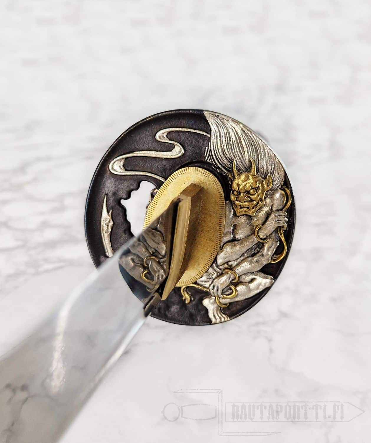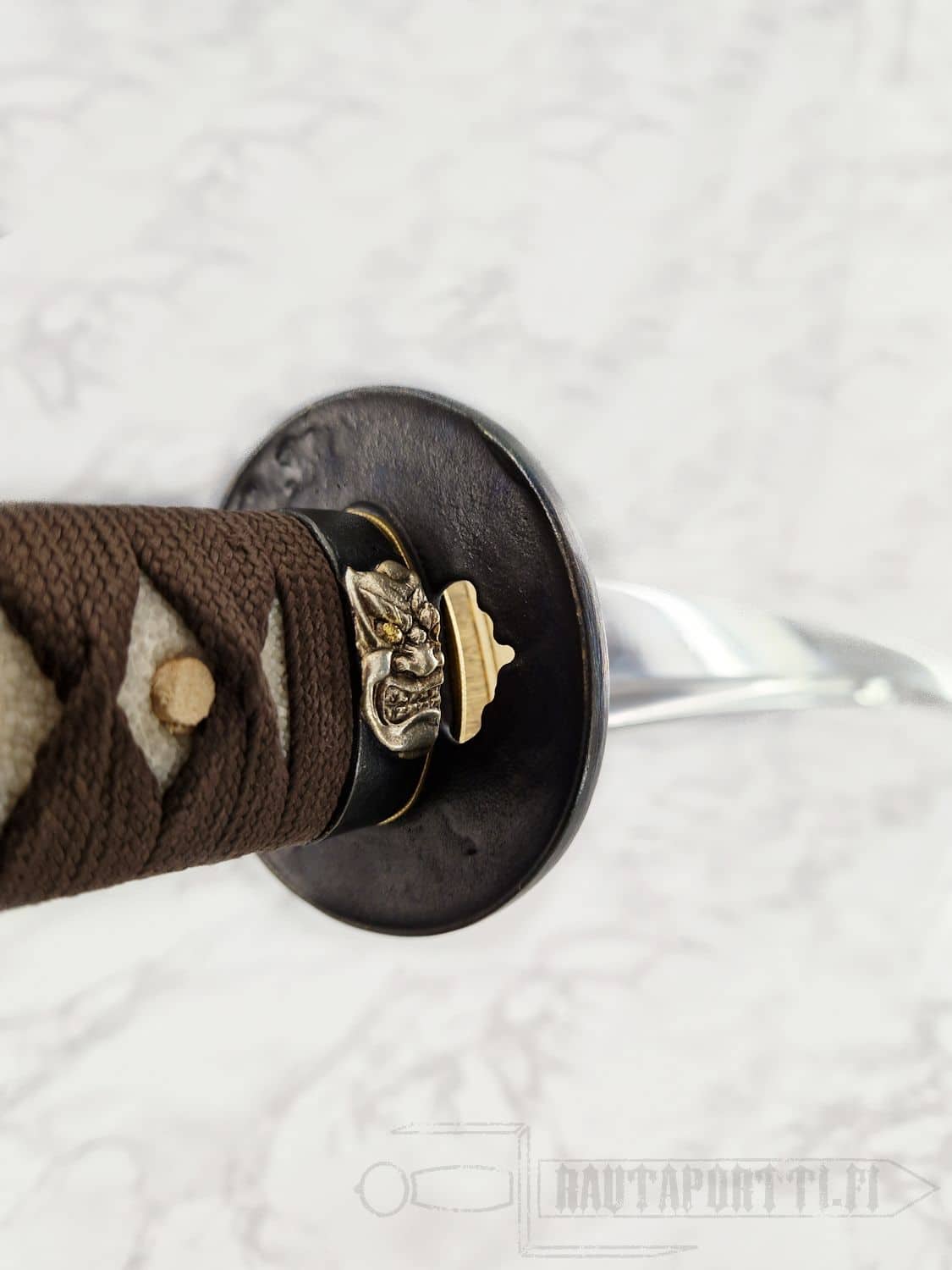 The nagasa is skillfully hand forged and polished using only traditional methods. It's made from super strong T10 steel and has an appealing and aggressive real clay tempered hamon line. The cutting edge is honed carefully by hand to ensure a razor sharp finish. Meticulously detailed and unique Yōkai Oni motif fuchi, kashira, tsuba and menukis elaborately fitted on hardwood tsuka with brown Katatemaki-wrapping (battle wrapping). Elegant brass habaki and seppa finalize the set.